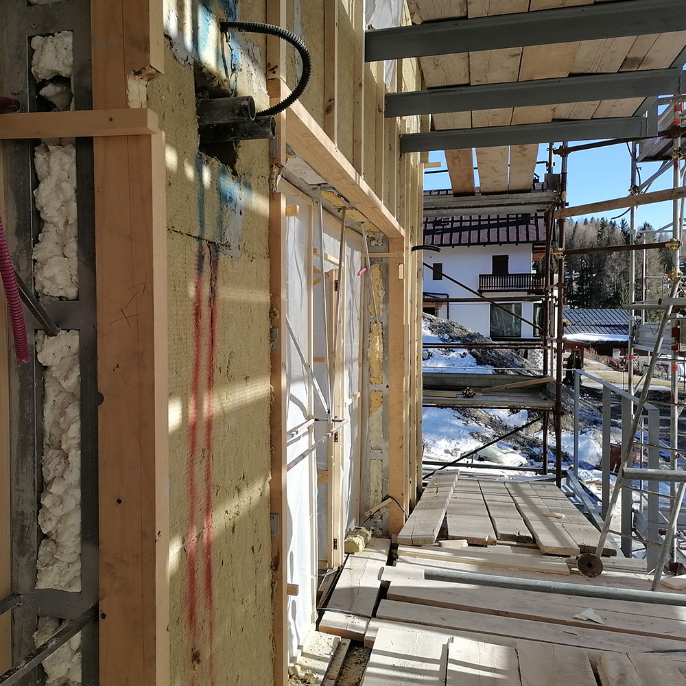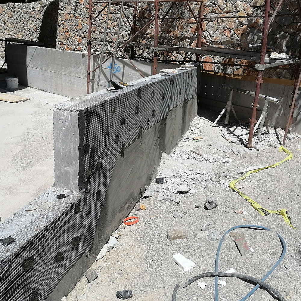 Per questa villa a Cortina abbiamo ristrutturato integralmente la residenza e realizzato un volume interrato di circa 300 mq. Il progetto ci ha visti impegnati nella realizzazione della berlinese con micropali e relativo muro controterra. Sono state realizzate le strutture in cemento armato quali il magrone armato, la platea di fondazione, i muri in elevazione e il solaio in soletta piena. Il cantiere poi ha visto il consolidamento dei muri dell’edificio esistente mediante iniezioni, posa di rete in fibra di carbonio e realizzazione di intonaco armato. Sempre in fase di ristrutturazione è stato realizzato il cappotto esterno in lana di roccia ed XPS con predisposizioni necessarie a ricevere il successivo rivestimento a pietra/legno. I lavori si sono conclusi con le opere di finiture esterne quali il rivestimento in pietra interno ed esterno, la sistemazione delle aree verdi esterne e la piantumazione.
