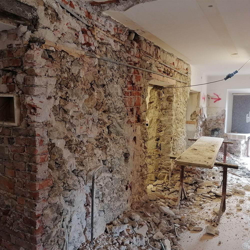Per questa unità abitativa a Cortina d’Ampezzo abbiamo ristrutturato integralmente gli interni. Nella prima fase del progetto sono state demolite le tramezze, rimossi gli intonaci e le pavimentazioni. Sono stati installati gli isolamenti acustici a pavimento con lana di roccia all’interno delle travature del solaio e posati i pannelli OSB. In merito alla ristrutturazione sono stati consolidati i solai lignei esistenti e le murature portanti in pietra mediante iniezioni, posa rete elettrosaldata ed esecuzione di intonaco sabbia-cemento. In fase di ammodernamento dello stabile sono stati installati i nuovi impianti tecnologici e realizzate le opere di finitura quali intonaci, controsoffitti in legno e posa delle piastrelle del pavimento.